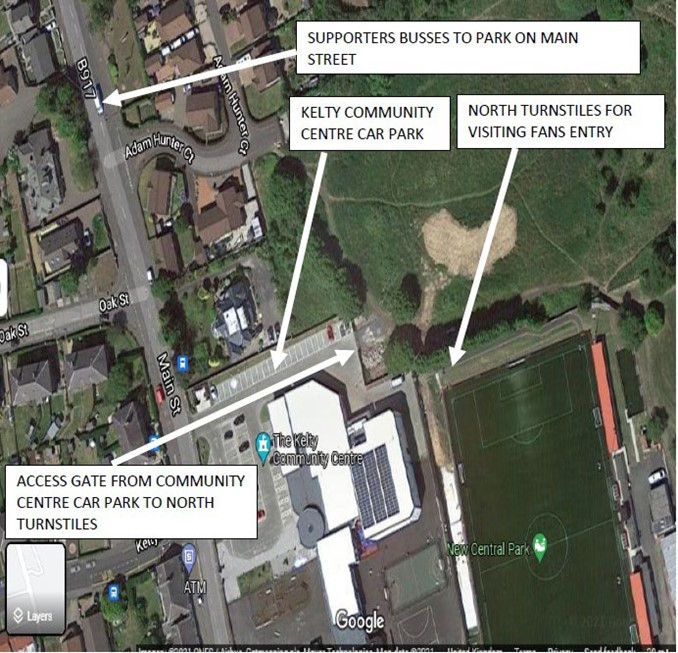 Supporters busses are are requested to park on Main Street, Kelty to the north of Kelty Community Centre. Supporters travelling by car are requested to utilise free spaces within the Kelty Community Centre car park, or adjacent to supporters busses on Main Street.